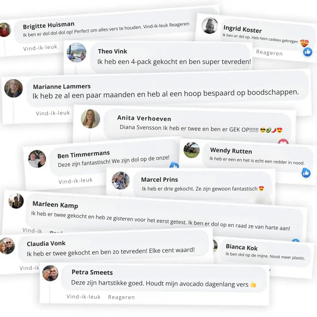 Ik ben dol op deze! Ik heb een complete set voor ui, tomaat, citroen, limoen en avocado. Veel beter dan die harde doosjes waarvan gezegd wordt dat ze hetzelfde doen. Ik heb ze zonder problemen in het bovenste deel van de vaatwasser gedaan en heb mijn set nu al jaren. Mijn vriendin uit Australië was zo onder de indruk dat ze een set mee naar huis nam. Beste aankoop ooit!